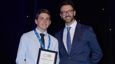 Trent Sutton from ClubsNSW presents the Junior Sports Star award to Blake Hunter of the Macarthur Chronicle. |